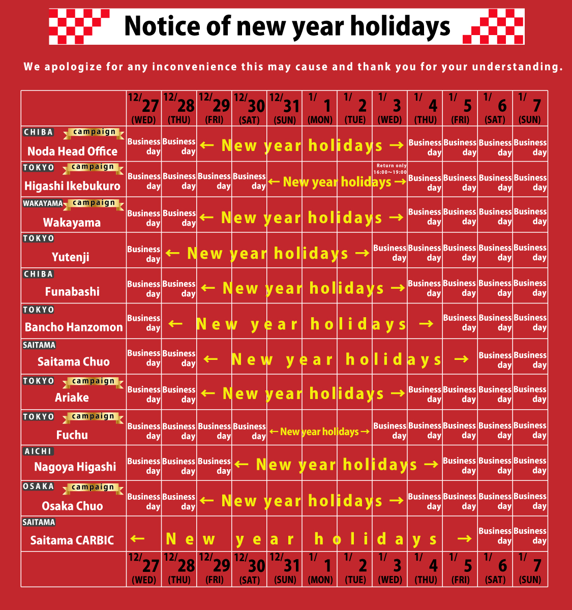 【Noda head office】December 29, 2023 (Fri) - January 3, 2024 (Wed)