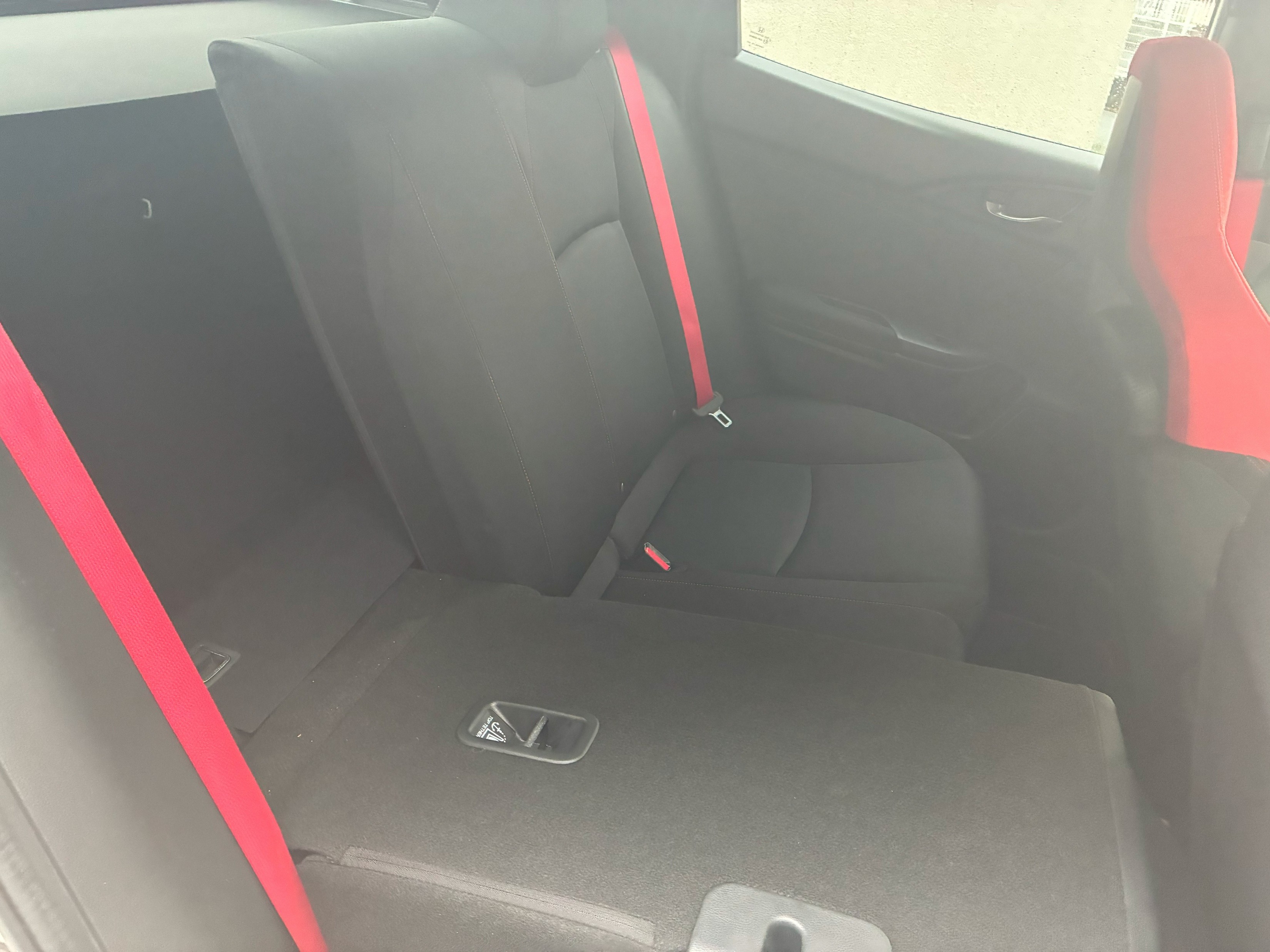 The interior is primarily black, with striking red accents on the steering wheel and dashboard. The semi-bucket sports seats feature red contact surfaces and black sides, reminiscent of a race car, while also evoking a sense of luxury.