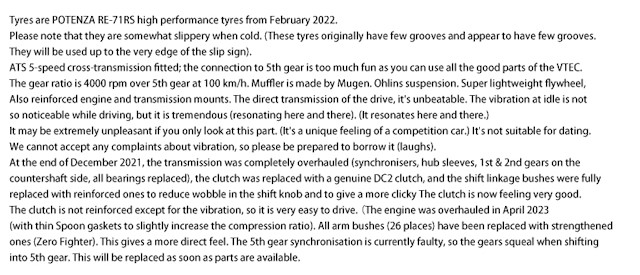 ATSのクロスミッションは1速及び2速のみ装着済み。3速、4速、5速はノーマルギアとなります。マフラーは無限製。足はオーリンズ。超軽量フライホイール、また、強化エンジン、ミッションマウント。ダイレクトに駆動を伝える感じ、たまりませんね。走行中はさほど気にならないのですが、アイドリングでの振動は凄まじいものがあります。(あちらこちら共振しています)ここだけみると不快極まりないかもしれません。(競技車独特な感じです)デートには向かないですね。振動のクレームお受けできませんので覚悟してお借りください(笑)