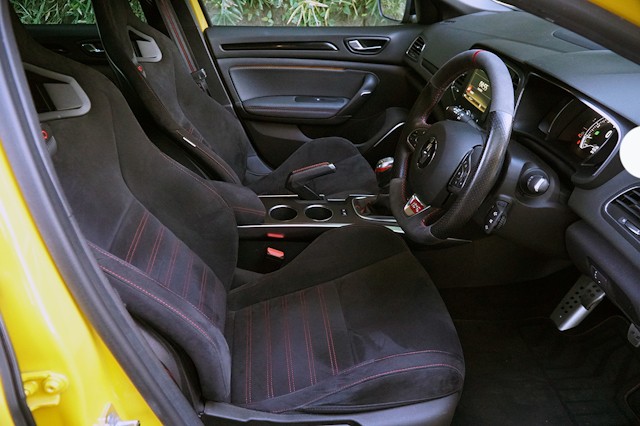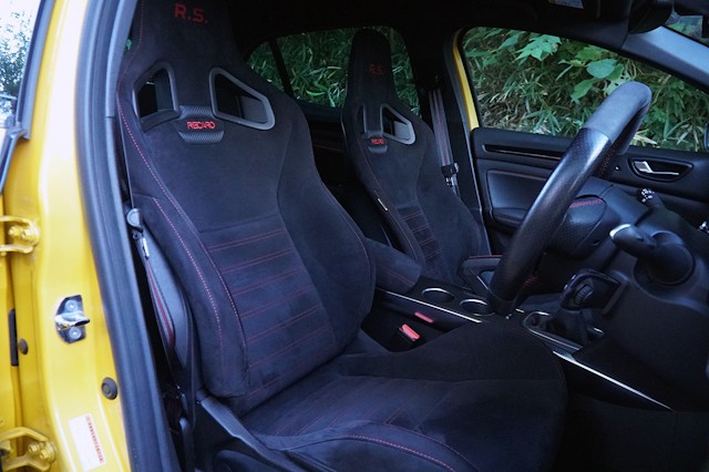 こちらは2020年登録のトロフィー 6速マニュアル車となります。従来型より最高出力を21PS増の300PSへ、最大トルクを30N・m増の420N・mへとアップしている。単にブースト圧を高めただけではなく、メガーヌR.S.のボールベアリングタービンに対して、よりレスポンスに優れるセラミックボールベアリングタービンに変更。サスペンションはノーマルの“シャシースポール”に対して、“シャシーカップ”を採用する。スプリングレートはフロントが23%、リアが35%も高められ、アンチロールバーは7%ハードなものに。ダンパー減衰力は25%増という、かなり締め上げられた仕様。